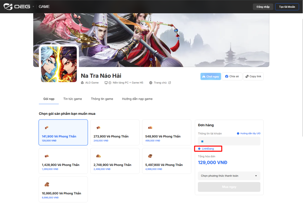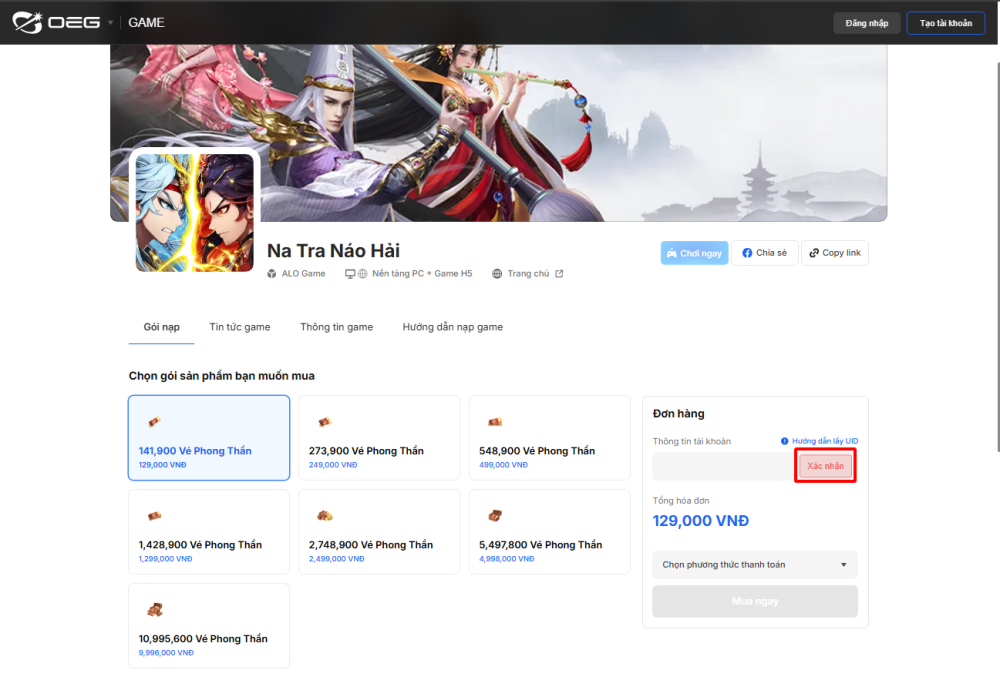 Bước 2: Chọn gói Vé Phong Thần muốn nạp và nhập UID nhân vật