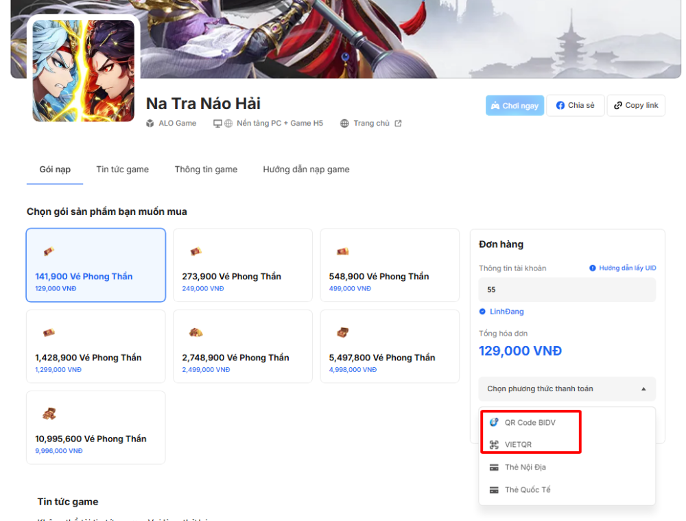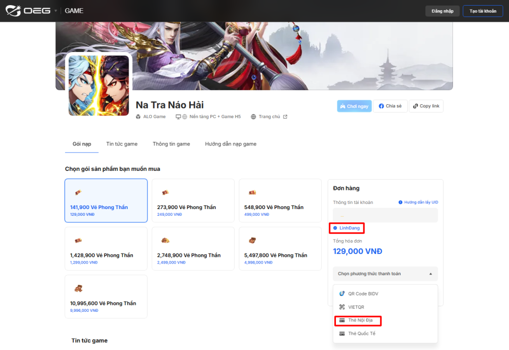 Tại Na Tra Náo Hải, Linh Tướng có thể nạp qua web thông qua các phương thức sau: